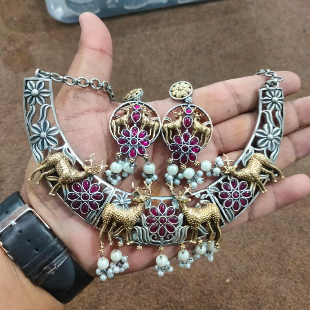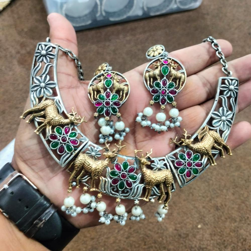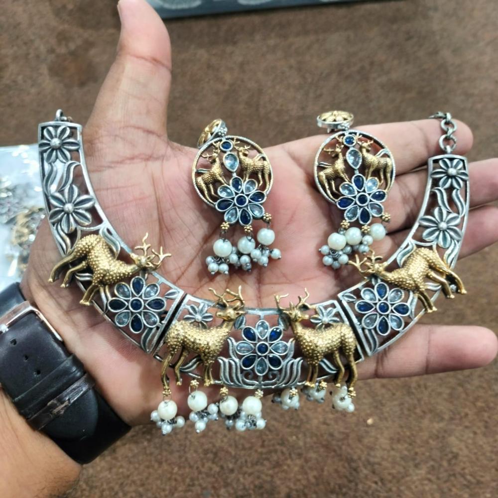 FS Collection Stylish 2-Tone Plated Pota Stones And Pearl Necklace Set